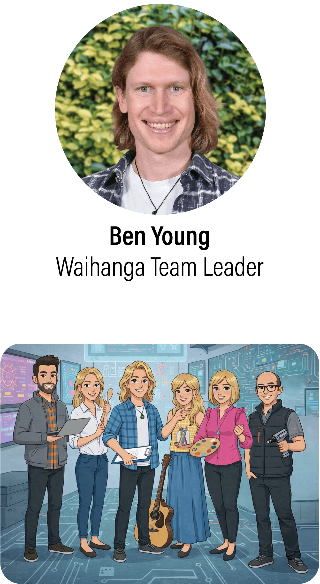 The Waihanga is led by Ben Young, whose broad experience and passion for learning provide students with rich, future-focused opportunities. Drawing on his expertise in technology, performing arts, music, audio production, and Kapa Haka, Ben's leadership ensures that students are challenged, supported, and inspired to reach their full potential.